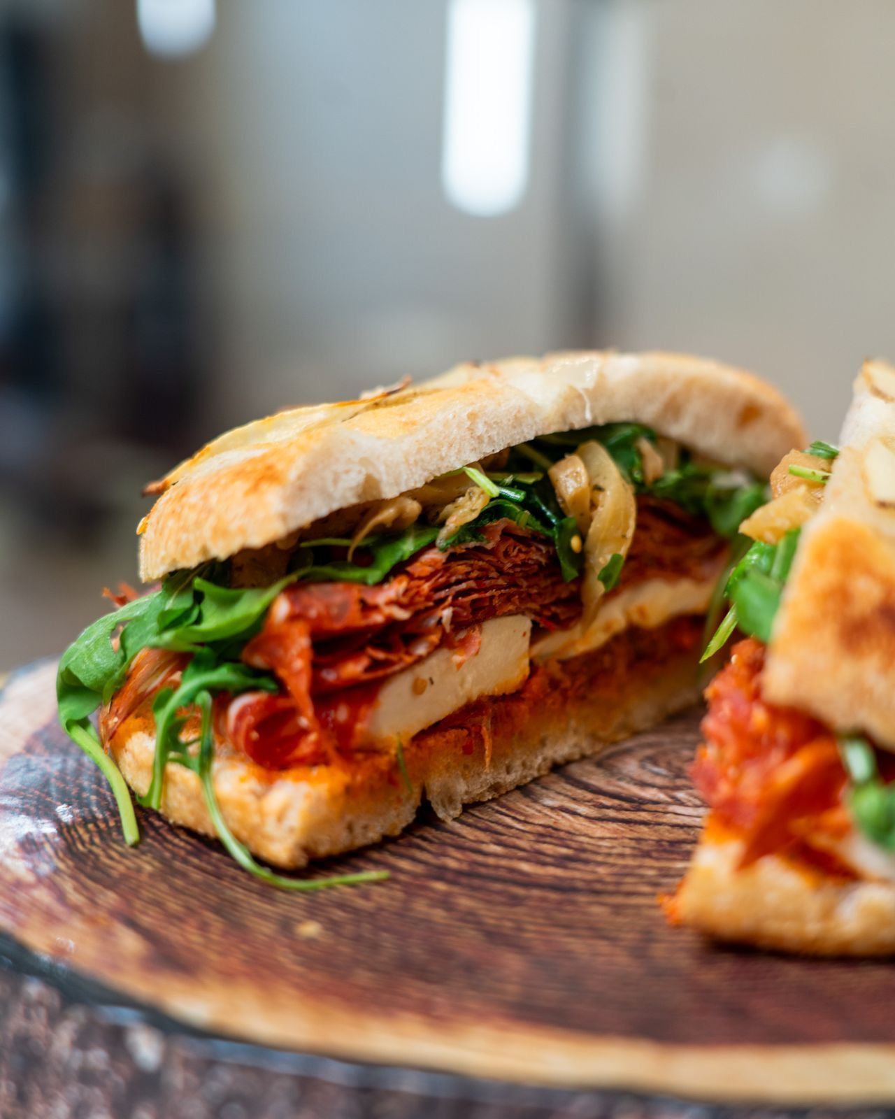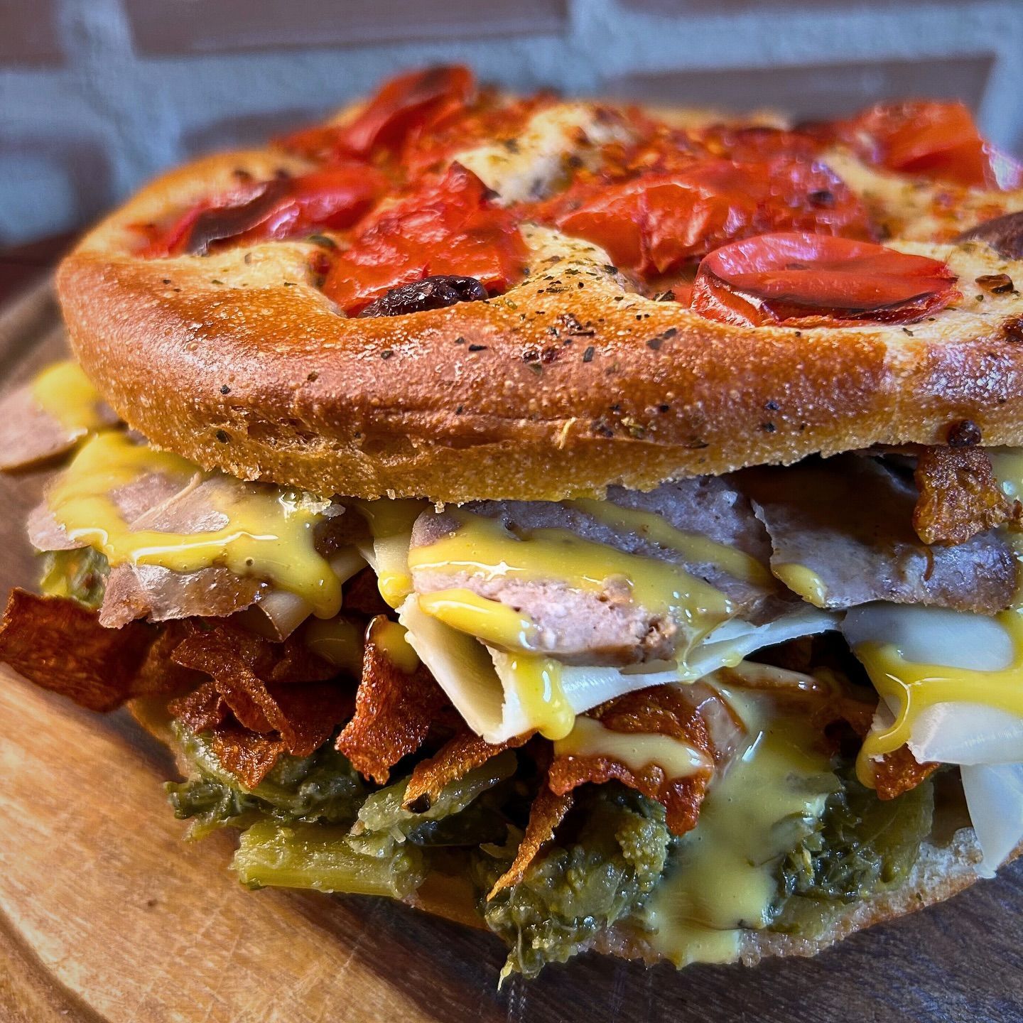 Calabrian chili cream, ricotta, smoked mozzarella, mushrooms, eggplant, cabbage, tarallo crumbles.