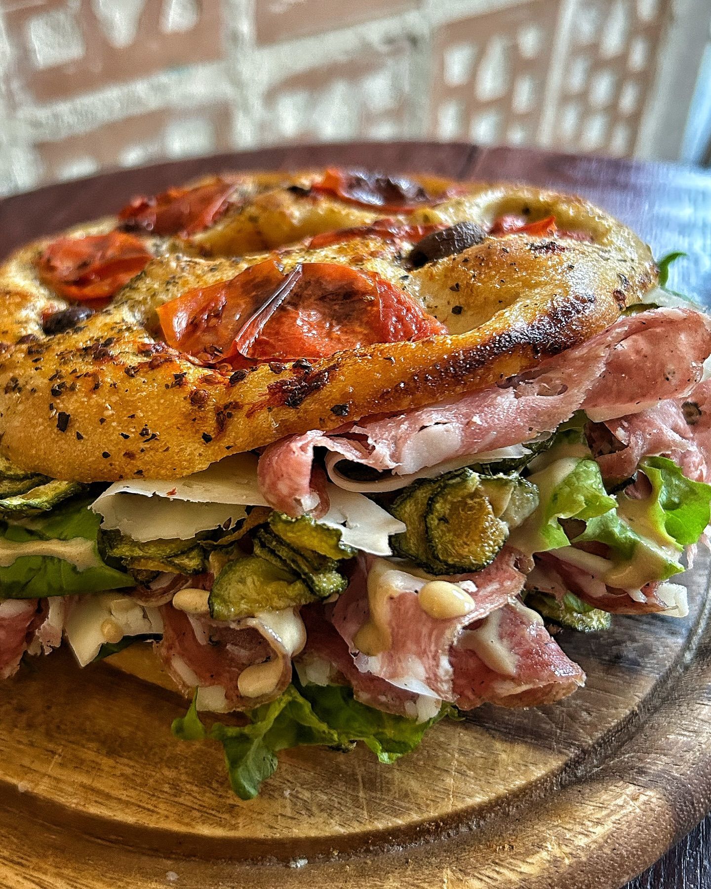 Mozzarella fior di latte, tomatoes, eggplant, turkey, lettuce.